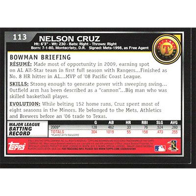 This is a 2010 Bowman Nelson Cruz baseball card. The card is #113 and pictures show condition.