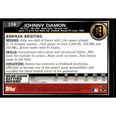 This is a 2010 Bowman Johnny Damon baseball card. The card is #156 and pictures show condition.