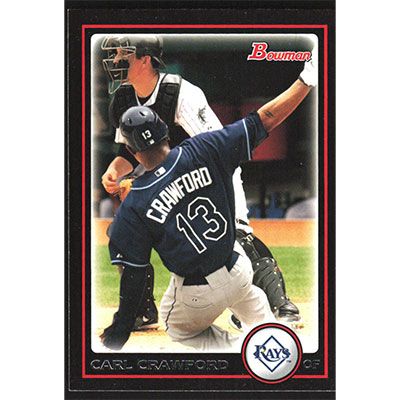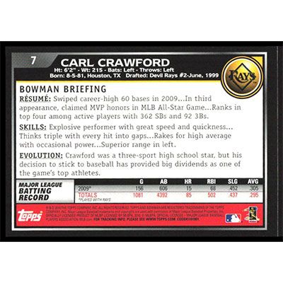 This is a 2010 Bowman Carl Crawford baseball card. The card is #7 and pictures show condition.