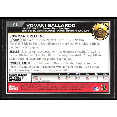 This is a 2010 Bowman Yovani Gallardo baseball card. The card is #71 and pictures show condition.
