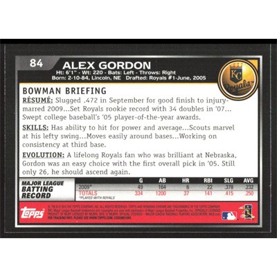 This is a 2010 Bowman Chrome Alex Gordon baseball card. The card is #84 and pictures show condition.