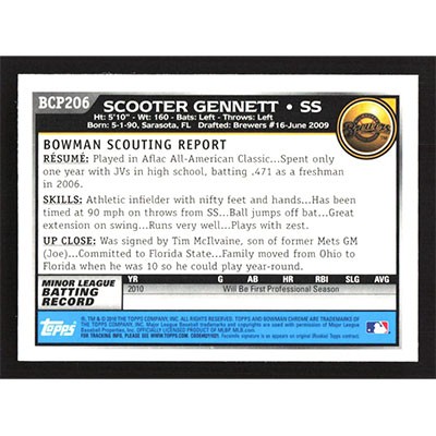 This is a 2010 Bowman Chrome Prospects Autographs Scooter Gennett autographed baseball card. This card has been signed, in blue, by Scooter Gennett, and is guaranteed authentic by Ballcardz.com. The card is #BCP206 and pictures show condition.