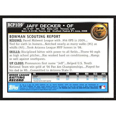 This is a 2010 Bowman Chrome Prospects Jaff Decker autographed baseball card. This card has been signed, in blue, by Jaff Decker, and is guaranteed authentic by Ballcardz.com. The card is #BCP109 and pictures show condition.