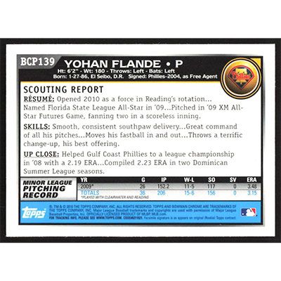 This is a 2010 Bowman Chrome Prospects Yohan Flande baseball card. The card is #BCP139 and pictures show condition.