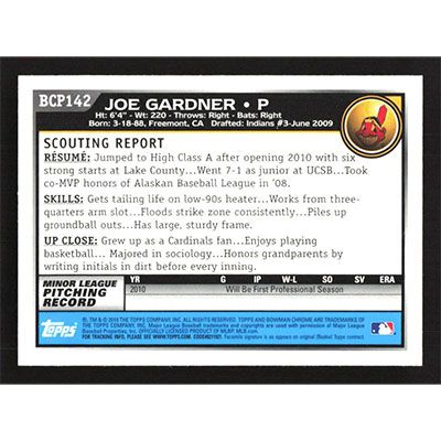 This is a 2010 Bowman Chrome Prospects Joe Gardner baseball card. The card is #BCP142 and pictures show condition.