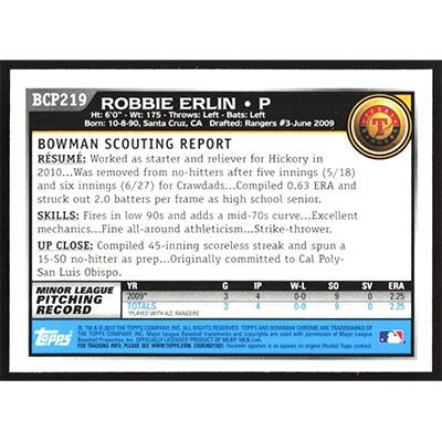 This is a 2010 Bowman Chrome Prospects Robbie Erlin baseball card. The card is #BCP219 and pictures show condition.