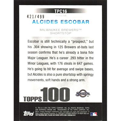 This is a 2010 Bowman Chrome Topps 100 Prospects Refractors Alcides Escobar baseball card. The card is #TPC16 and pictures show condition. This card is limited; #'d 421/499.
