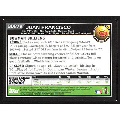 This is a 2010 Bowman Draft Juan Francisco autographed baseball card. This card has been signed, in black, by Juan Francisco, and is guaranteed authentic by Ballcardz.com. The card is #BDP79 and pictures show condition.
