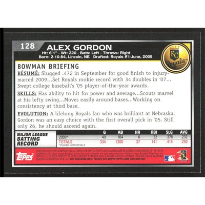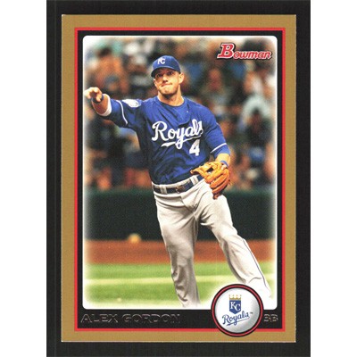 This is a 2010 Bowman Gold Alex Gordon baseball card. The card is #128 and pictures show condition.