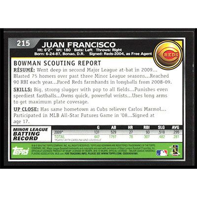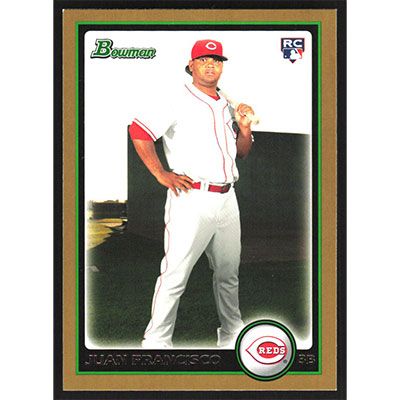 This is a 2010 Bowman Gold Juan Francisco baseball card. The card is #215 and pictures show condition.