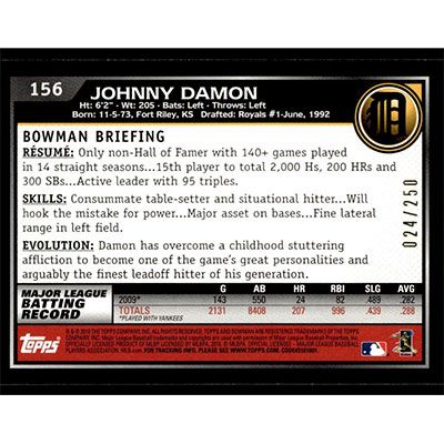 This is a 2010 Bowman Orange Johnny Damon baseball card. The card is #156 and pictures show condition. This card is limited; #'d 024/250. Team(s): Detroit Tigers