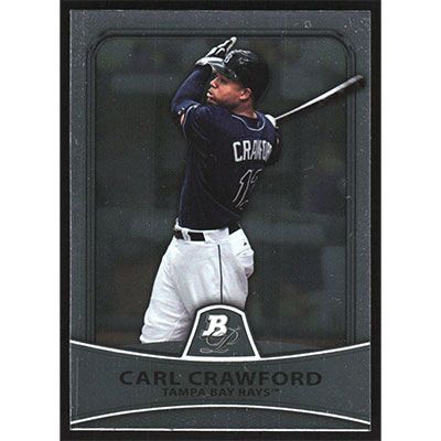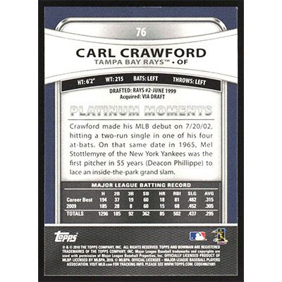 This is a 2010 Bowman Platinum Carl Crawford baseball card. The card is #76 and pictures show condition.