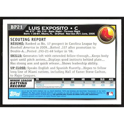 This is a 2010 Bowman Prospects Luis Exposito baseball card. The card is #BP21 and pictures show condition.