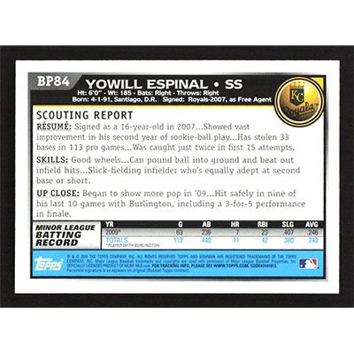 This is a 2010 Bowman Prospects Yowill Espinal baseball card. The card is #BP84 and pictures show condition.
