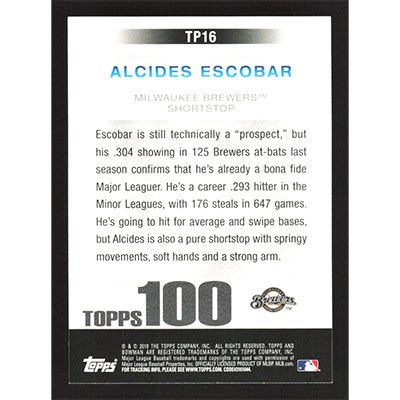 This is a 2010 Bowman Topps 100 Prospects Alcides Escobar baseball card. The card is #TP16 and pictures show condition.