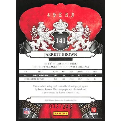 This is a 2010 Crown Royale Autographs Jarrett Brown autographed football card. This card has been signed, in blue, by Jarrett Brown, and is certified authentic by Panini. The card is #141 and pictures show condition. This card is limited; #'d 033/243.