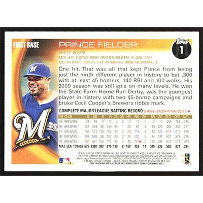 This is a 2010 Topps Prince Fielder baseball card. The card is #1 and pictures show condition.