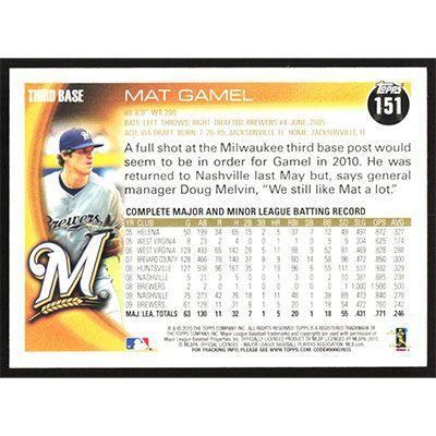 This is a 2010 Topps Mat Gamel baseball card. The card is #151 and pictures show condition.