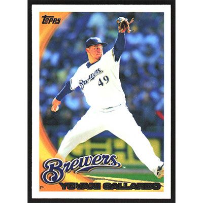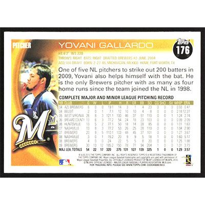 This is a 2010 Topps Yovani Gallardo baseball card. The card is #176 and pictures show condition.
