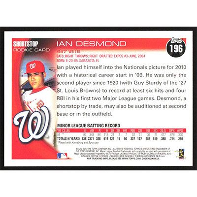 This is a 2010 Topps Ian Desmond baseball card. The card is #196 and pictures show condition.