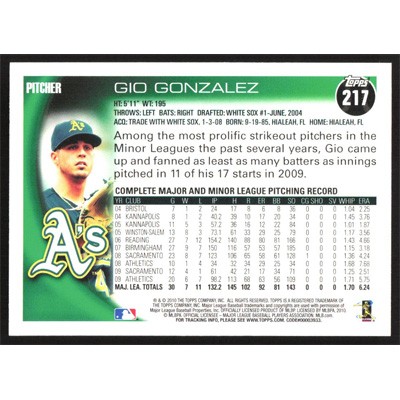 This is a 2010 Topps Gio Gonzalez baseball card. The card is #217 and pictures show condition.
