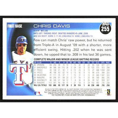 This is a 2010 Topps Chris Davis baseball card. The card is #255 and pictures show condition.