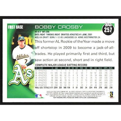 This is a 2010 Topps Bobby Crosby baseball card. The card is #257 and pictures show condition.