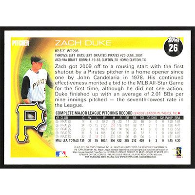 This is a 2010 Topps Zach Duke baseball card. The card is #26 and pictures show condition.