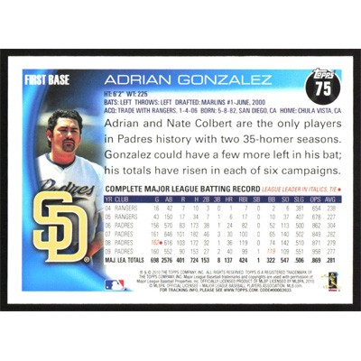 This is a 2010 Topps Adrian Gonzalez baseball card. The card is #75 and pictures show condition.