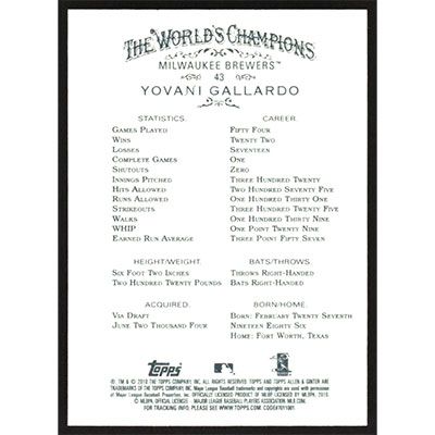 This is a 2010 Topps Allen & Ginter Yovani Gallardo baseball card. The card is #43 and pictures show condition.