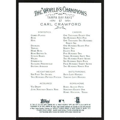 This is a 2010 Topps Allen & Ginter Carl Crawford baseball card. The card is #67 and pictures show condition.