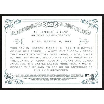 This is a 2010 Topps Allen & Ginter This Day in History Stephen Drew baseball card. The card is #TDH2 and pictures show condition. Team(s): Arizona Diamondbacks