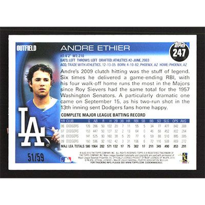 This is a 2010 Topps Black Andre Ethier baseball card. The card is #247 and pictures show condition. This card is limited; #'d 51/59. Team(s): Los Angeles Dodgers