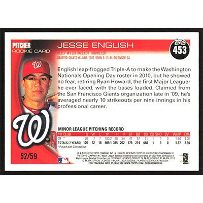 This is a 2010 Topps Black Jesse English baseball card. The card is #453 and pictures show condition. This card is limited; #'d 52/59. Team(s): Washington Nationals Rookie Card (RC)