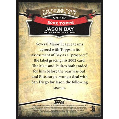 This is a 2010 Topps Cards Your Mom Threw Out 2002 Jason Bay baseball card. The card is #CMT167 and pictures show condition.