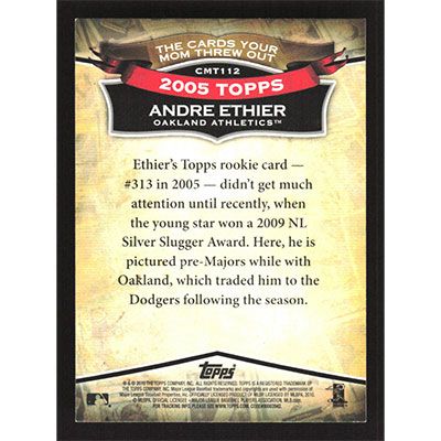 This is a 2010 Topps Cards Your Mom Threw Out Andre Ethier 2005 baseball card. The card is #CMT112 and pictures show condition. Team(s): Oakland Athletics