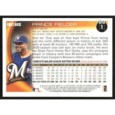 This is a 2010 Topps Chrome Prince Fielder baseball card. The card is #1 and pictures show condition.