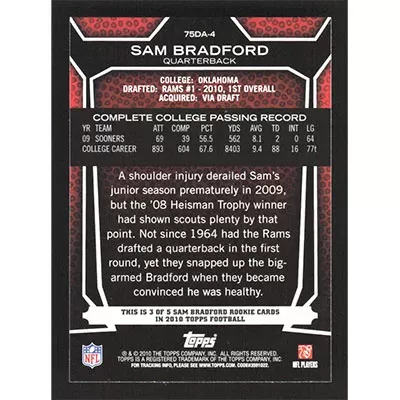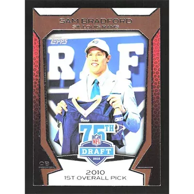 This is a 2010 Topps Draft 75th Anniversary Sam Bradford football card. The card is #75DA-4 and pictures show condition. Team: St. Louis Rams Rookie Card