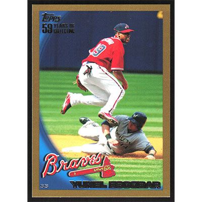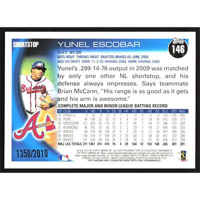 This is a 2010 Topps Gold Yunel Escobar baseball card. The card is #146 and pictures show condition. This card is limited; #'d 1350/2010. Team(s): Atlanta Braves