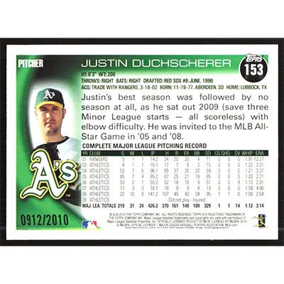 This is a 2010 Topps Gold Justin Duchscherer baseball card. The card is #153 and pictures show condition. This card is limited; #'d 0912/2010. Team(s): Oakland Athletics