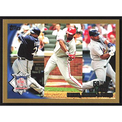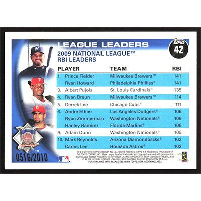 This is a 2010 Topps Gold Prince Fielder, Ryan Howard and Albert Pujols League Leaders baseball card. The card is #42 and pictures show condition. This card is limited; #'d 0516/2010.