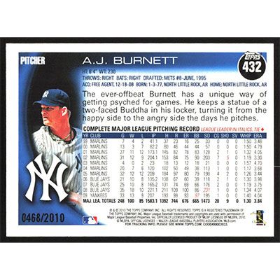 This is a 2010 Topps Gold A.J. Burnett baseball card. The card is #432 and pictures show condition. This card is limited; #'d 0468/2010. Team(s): New York Yankees