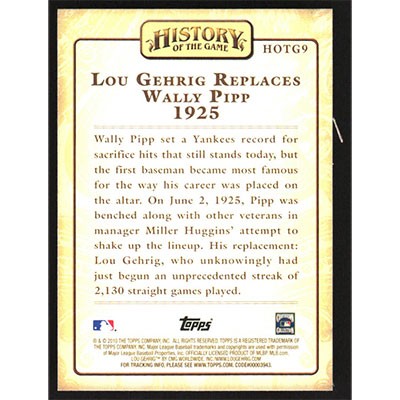 This is a 2010 Topps History of the Game Lou Gehrig Lou Gehrig Replaces Wally Pipp 1925 baseball card. The card is #HOTG9 and pictures show condition. Team(s): New York Yankees