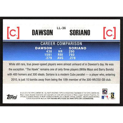 This is a 2010 Topps Legendary Lineage Andre Dawson and Alfonso Soriano baseball card. The card is #LL-36 and pictures show condition. Team(s): Chicago Cubs
