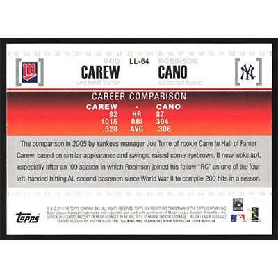 This is a 2010 Topps Legendary Lineage Rod Carew and Robinson Cano baseball card. The card is #LL-64 and pictures show condition. Team(s): Minnesota Twins/New York Yankees