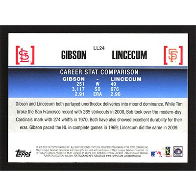 This is a 2010 Topps Legendary Lineage Bob Gibson and Tim Lincecum baseball card. The card is #LL24 and pictures show condition. Team(s): St. Louis Cardinals/San Francisco Giants
