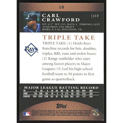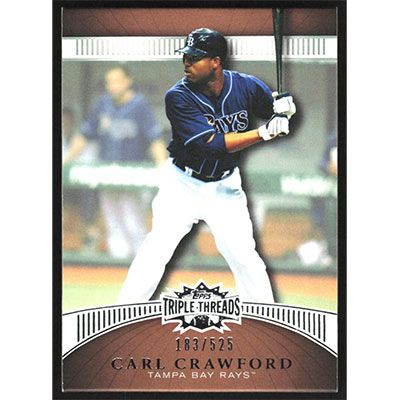 This is a 2010 Topps Triple Threads Sepia Carl Crawford baseball card. The card is #18 and pictures show condition. This card is limited; #'d 183/525. Team(s): Tampa Bay Rays