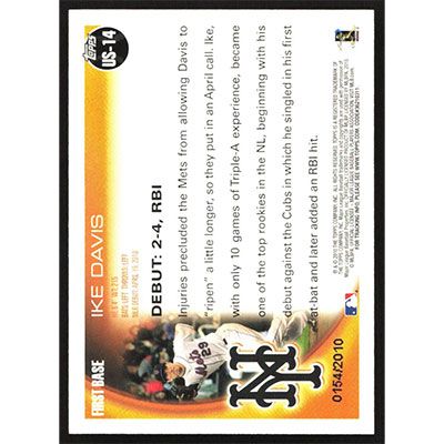 This is a 2010 Topps Update Gold Ike Davis Rookie Debut baseball card. The card is #US-14 and pictures show condition. This card is limited; #'d 0154/2010.