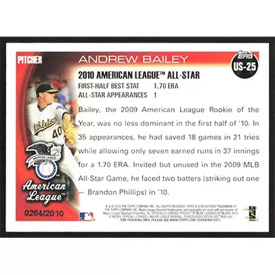This is a 2010 Topps Update Gold Andrew Bailey baseball card. The card is #US-25 and pictures show condition. This card is limited; #'d 0264/2010. Team(s): Oakland Athletics