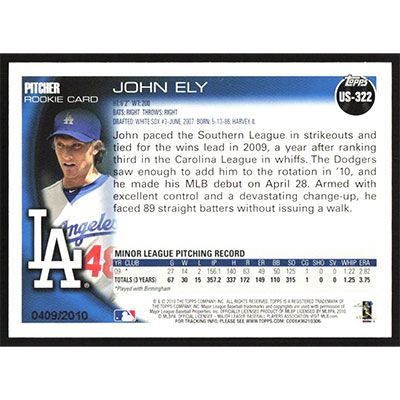 This is a 2010 Topps Update Gold John Ely baseball card. The card is #US-322 and pictures show condition. This card is limited; #'d 0409/2010. Team(s): Los Angeles Dodgers Rookie Card (RC)